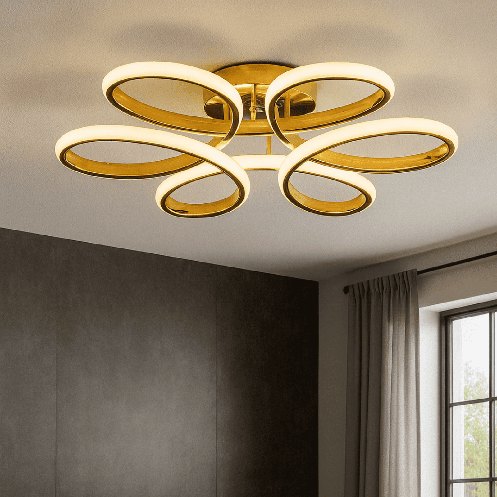 Ndriçues plafoni me stil modern dhe ngjyrë gold që i jep ambientit një pamje luksoze dhe të rafinuar. Ideal për sallon apo dhomë.
