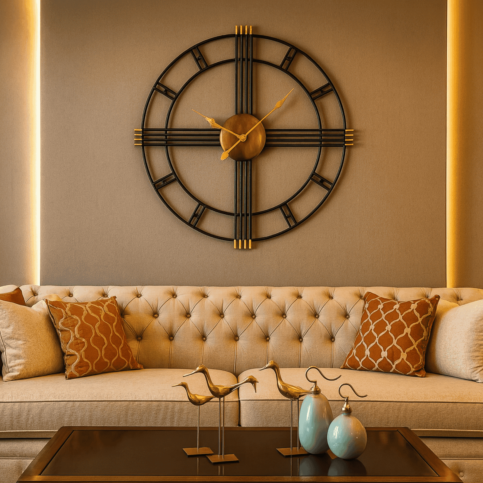 Me një kombinim perfekt të ngjyrës së zezë dhe detajeve gold, kjo orë krijon një pamje luksoze dhe të sofistikuar në sallon, zyrë apo dhomë pritjeje.